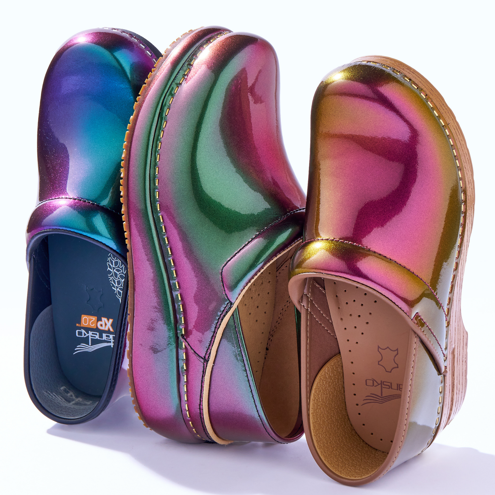 Step up your style and comfort game with the Platform Pro Funky Colorshift Patent! This bold platform clog packs extra cushion and chunky attitude into the classic Dansko silhouette, featuring memory foam for all-day support and a slip-resistant sole for steady strides. The vibrant colorshift patent leather adds a playful, dynamic edge—making every step a fearless statement from workday to weekend.